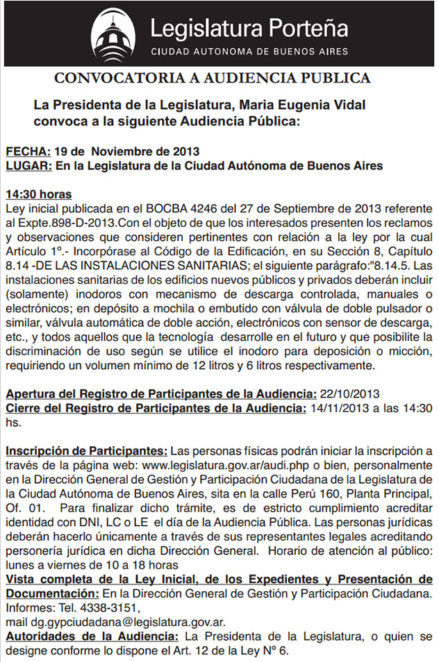 La presidenta de la Legislatura, María Eugenia Vidal convoca a la siguiente Audiencia Pública: