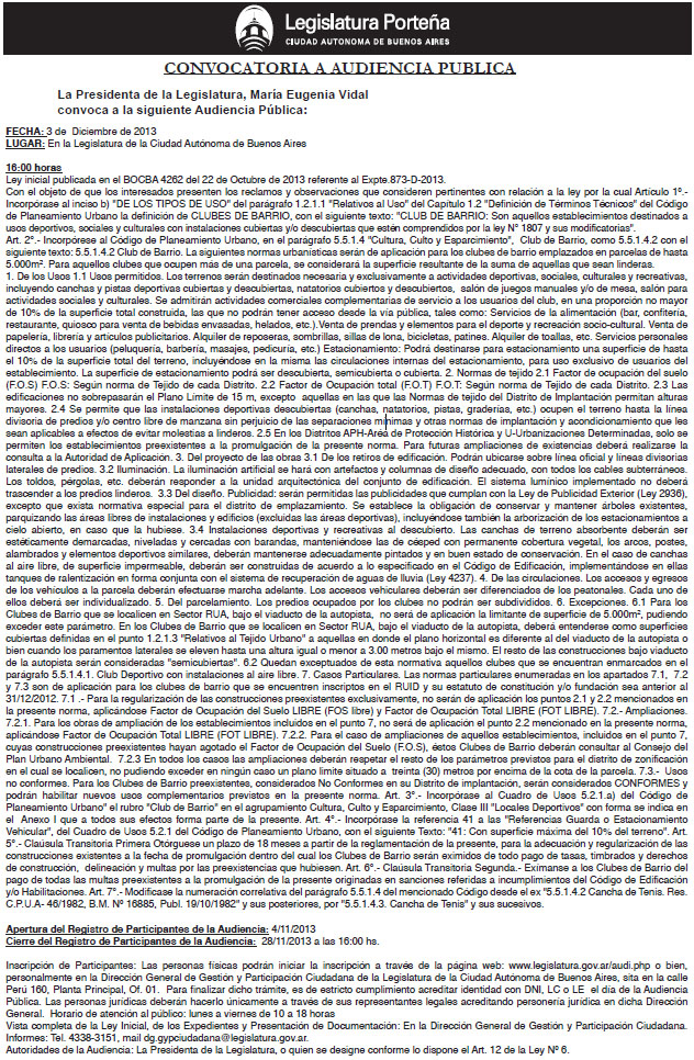 La presidenta de la Legislatura, María Eugenia Vidal convoca a la siguiente Audiencia Pública: