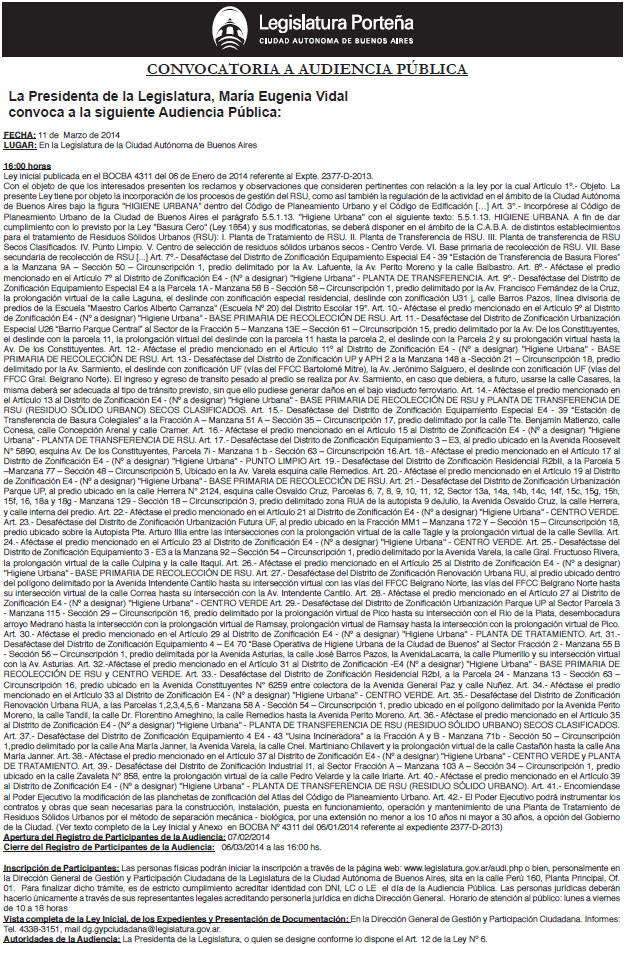 La Presidenta de la Legislatura, María Eugenia Vidal convoca a la siguiente Audiencia Pública: