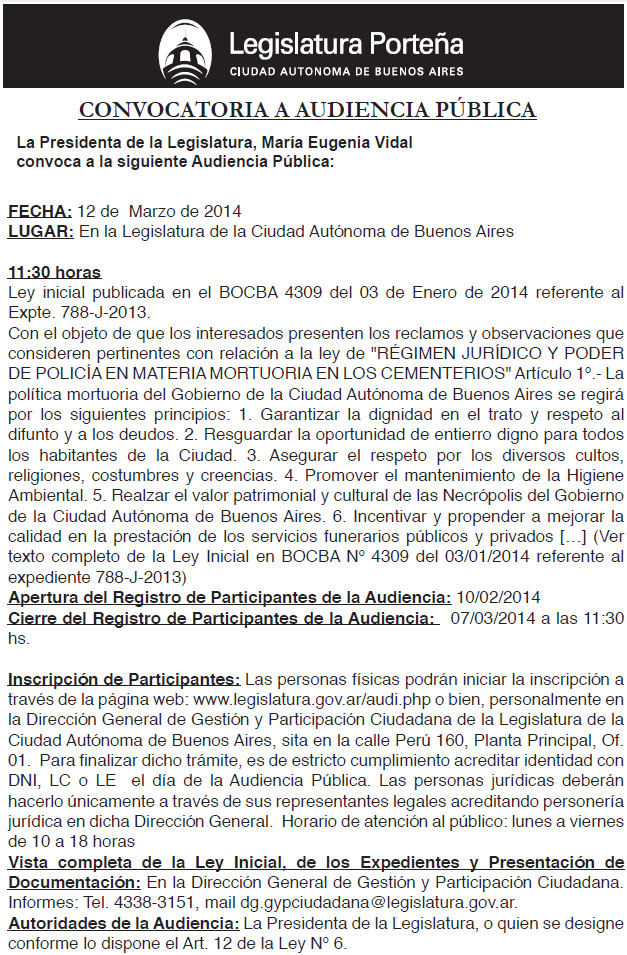 La Presidenta de la Legislatura, María Eugenia Vidal convoca a la siguiente Audiencia Pública: