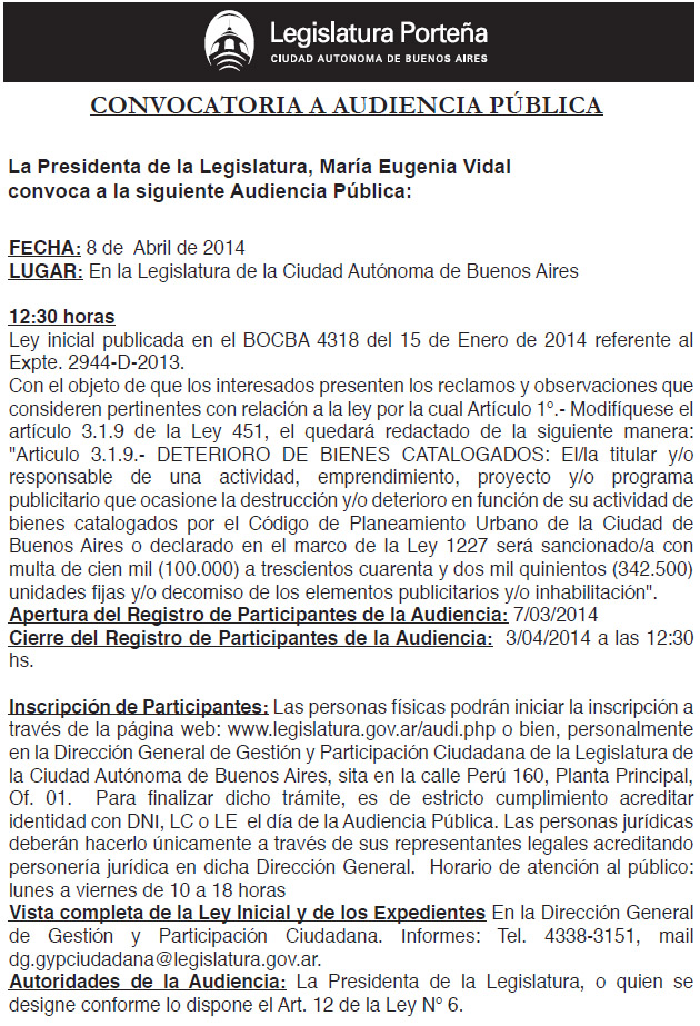 La Presidenta de la Legislatura, María Eugenia Vidal convoca a la siguiente Audiencia Pública:
