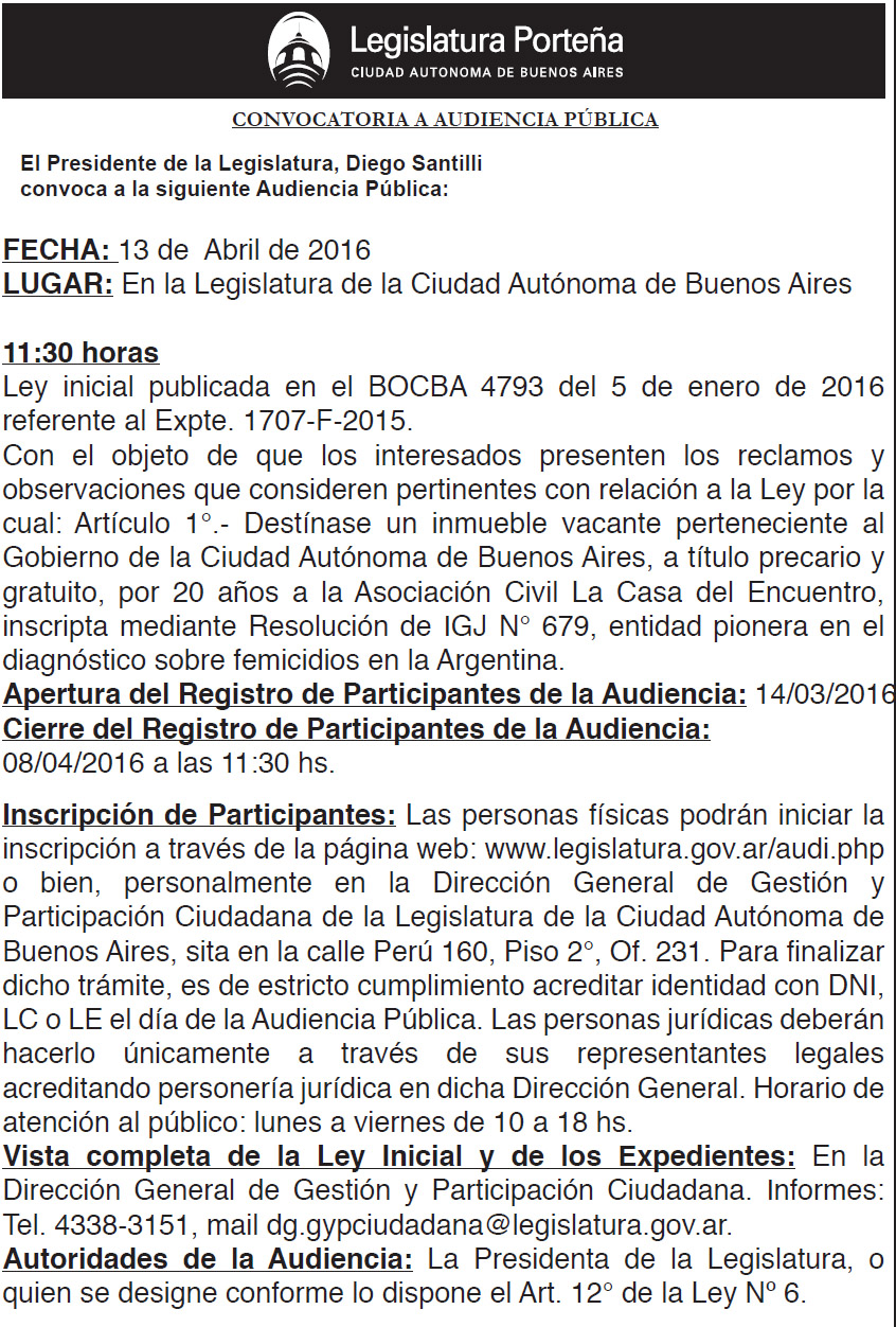 El Presidente de la Legislatura, Diego Santilli convoca a la siguiente Audiencia Pública: