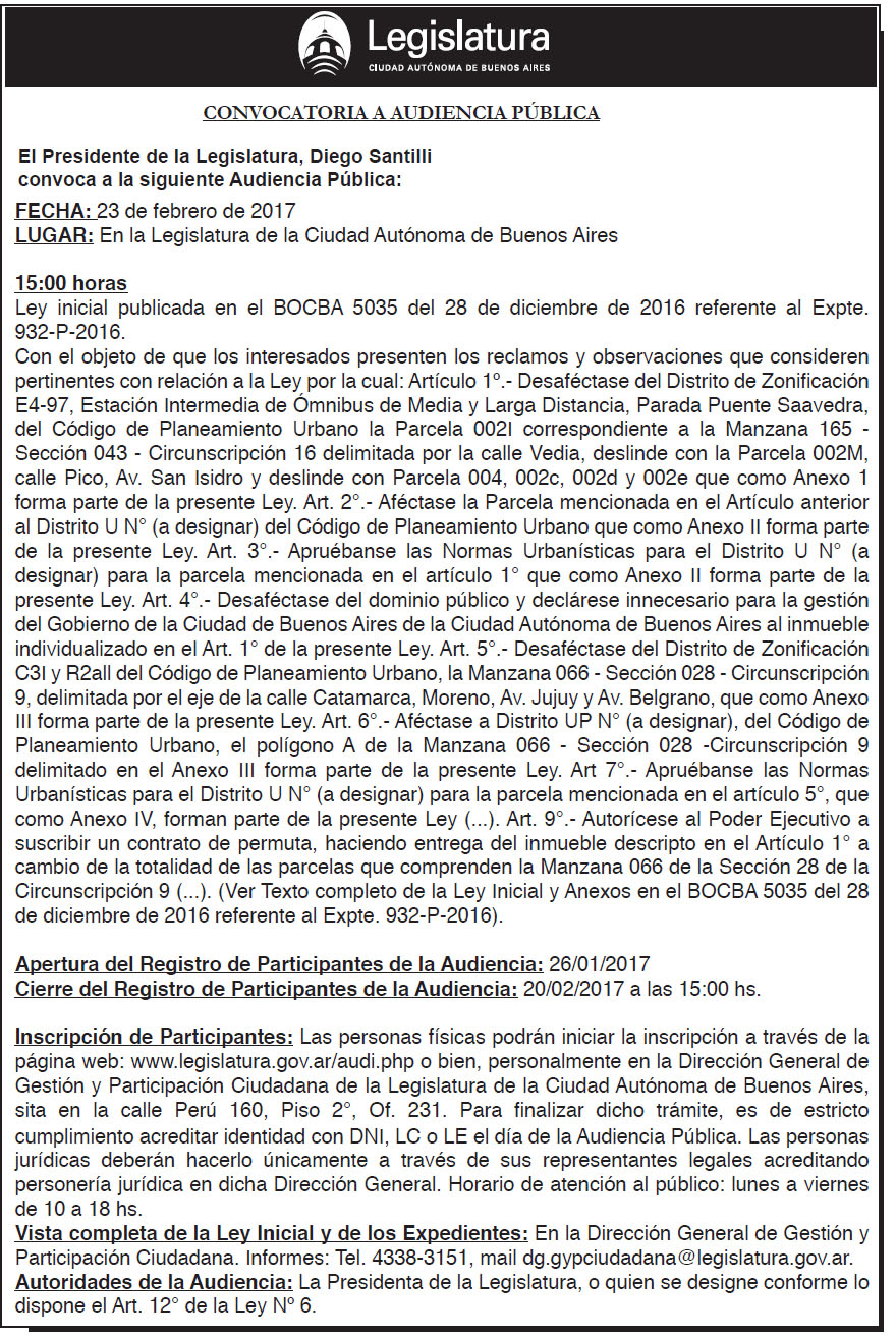 El Presidente de la Legislatura, Diego Santilli convoca a la siguiente Audiencia Pública: