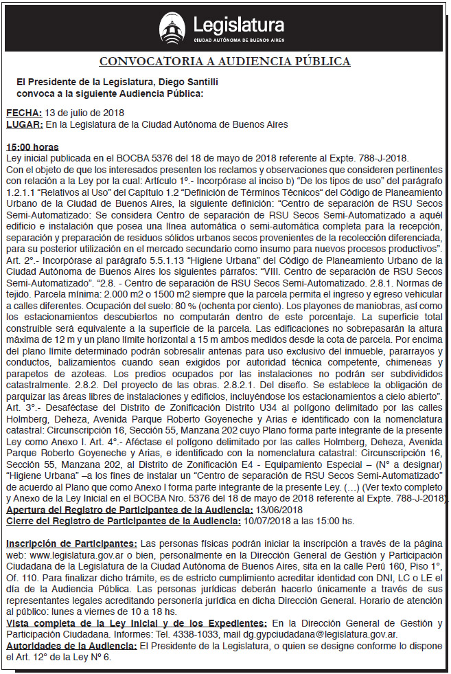 El Presidente de la Legislatura, Diego Santilli convoca a la siguiente Audiencia Pública: