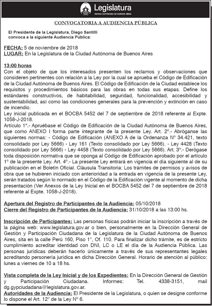 Con el objeto de que los interesados presenten los reclamos y observaciones que consideren pertinentes con relación a la Ley por la cual se aprueba el Código de Edificación de la Ciudad Autónoma de Buenos Aires.