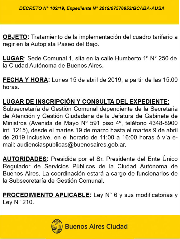 Tratamiento de la implementación del cuadro tarifario a regir en la Autopista Paseo del Bajo