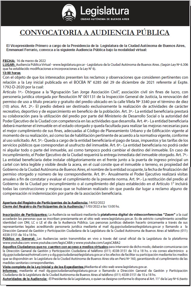 Lugar: Audiencia Pública Virtual - www.legislatura.gov.ar - Legislatura de la Ciudad Autónoma de Buenos Aires. (Según Ley Nº 6.306