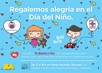 La Ciudad lanza la campaña solidaria de recolección de juguetes para el Día del Niño, una iniciativa organizada por el Gobierno de la Ciudad de Buenos Aires junto a Manos Abiertas y Cáritas Buenos Aires, durante el mes de Julio y Agosto se desarrollará la campaña "Regalemos alegría en el Día del Niño" en eventos culturales y deportivos en la Ciudad. Los vecinos podrán acercar juguetes en buen estado para que, a través de las ONG Manos Abiertas y Cáritas Buenos Aires, más chicos reciban un regalo en su día.