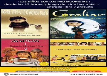 Cuatro películas para niños en marzo, "En donde viven los monstruos, Coraline, Matilda, y Pequeña Miss Sunshine", en el Espacio Cultural Carlos Gardel, ubicado en Olleros 3640, de la Ciudad Autónoma de Buenos Aires, toda la programación es con entrada libre y gratuita.