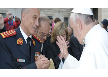 Luego de compartir su catequesis, Francisco se acercó a la comitiva de bomberos voluntarios con quienes intercambió unas conmovedoras palabras y, en medio de una gran emoción y respeto, el presidente de Bomberos de Argentina y América Carlos A. Ferlise, le entregó como obsequio un casco que llevaba impreso el nombre de Francisco.