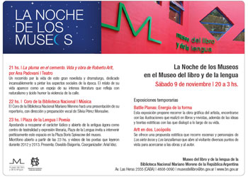 Sábado 9 de noviembre, La Noche de los Museos, de 20:00 a 3 horas, el Museo del libro y de la lengua participa en la Noche de los Museos con sus exposiciones y actividades especiales.