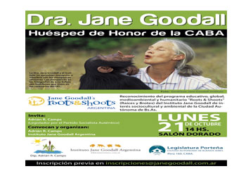 21 de octubre – Buenos Aires,Ceremonia de entrega de distinciones de "Huésped de Honor a la Dra. Jane Goodall", en la Legislatura de la Ciudad de Buenos Aires.