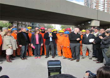 El Jefe de Gobierno camino a su llegada hacia donde lo esperaban vecinos y periodistas, con todos los obreros y Ingenieros de la empresa Autopistas Urbanas que participaron el la realización de la obra.