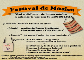 El dia sábado 12 de octubre a las 20:00 horas, en el Auditorio del Banco Credicoop de Villa Urquiza, Bucareli 2696, se realizara un Festival de Música, del grupo Ecosistema, a beneficio de Ecobolsas, proyecto de inclusión social que genera trabajo y difunde la Ecología, a Ecobolsas la integran jóvenes en situación de calle que tienen entre 18 y 35 años.