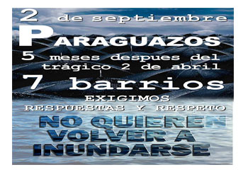 Bajo la consigna del Paraguazo y Basta de inundaciones, hoy lunes 2 de setiembre del 2013,a cinco meses de la última Inundación sufrida el 2 de abril del 2013, los vecinos de diferentes comunas, según expresan a causa de la inoperancia de los gobiernos de la CABA, Nación y Provincia de Bs As., nucleados en la Coordinadora de Inundados renuevan los reclamos en distintos puntos de la Capital y Provincia de Bs As.