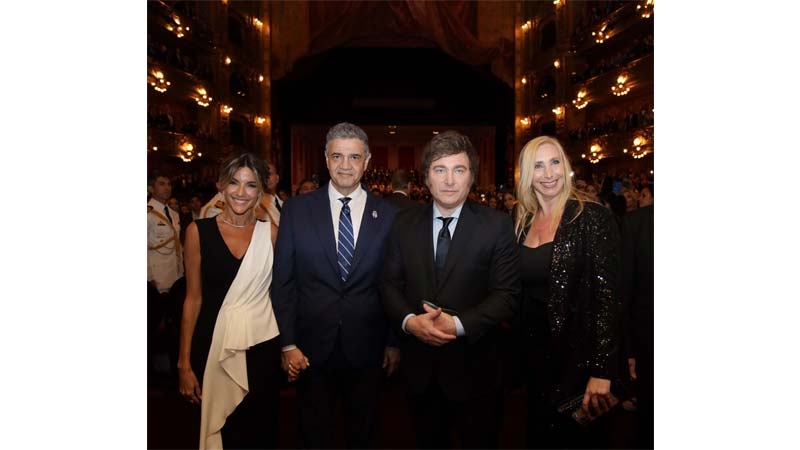 El jefe de Gobierno de la Ciudad de Buenos Aires, Jorge Macri, junto a su esposa, María Belén Ludueña, recibieron el domingo a la noche al presidente, Javier Milei, y a la Secretaria General de la Presidencia, Karina Milei, en el Teatro Colón, donde se realizó la gala por el cierre de la asunción.