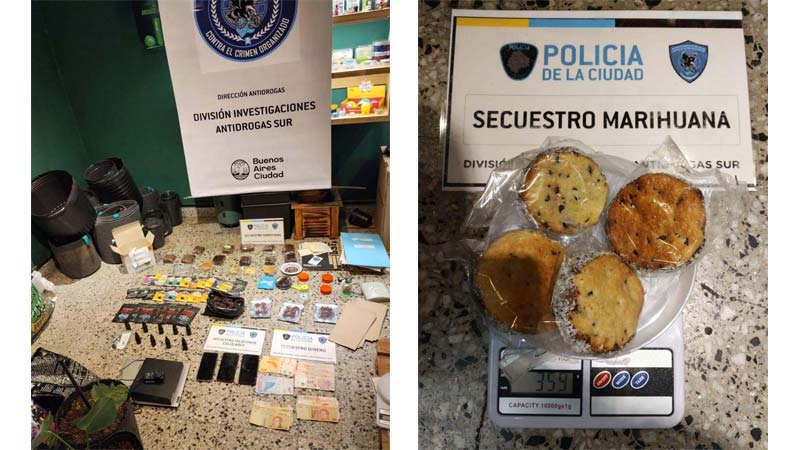Los oficiales secuestraron 17 gomitas con sustancia sintética, con la forma de marihuana, 11 brownies de cannabis, cuatro alfajores de cannabis, 31 paquetes con semillas, 10 frascos con aceite de cannabis, una bolsa cogollos, una lata y un paquete cerrado con marihuana y cinco picadores con restos de sustancias.