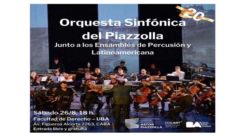 El sábado 26 de agosto a las 18:00 horas se realizará el concierto de la Orquesta Sinfónica del Conservatorio Astor Piazzolla, que festeja su 20° aniversario con un programa espectacular, que incluye obras de Gustav Holst, Wolfgang Amadeus Mozart, Franz Schubert y el estreno mundial de la obra “Suite 1890 Estudios sinfónicos criollos” de Edgar Ferrer, director de la orquesta desde su creación en 2003. El concierto tendrá lugar en el Salón de Actos de la Facultad de Derecho de la UBA, Av. Figueroa Alcorta 2263, CABA, y la entrada será libre y gratuita.