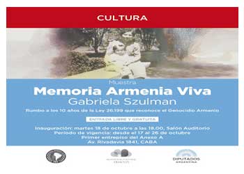 El próximo 18 de octubre en el auditorio del anexo A del Congreso Nacional de la Av. Rivadavia 1841, a las 18:00 horas, se inaugurará la muestra Memoria Armenia Viva, con un panel integrado por Brisa Varela, Khatchik DerGhougassian y Kissag Mouradian, la misma se podrá visitar hasta el 27 de octubre con entrada libre y gratuita, se enmarca a poco de cumplirse 10 años de la Ley 26.199, aprobada el 13 de diciembre de 2006 y promulgada el 15 de enero de 2007, en la que se declara todos los 24 de abril como el "Día de acción por la tolerancia y el respeto entre los pueblos" en conmemoración "del genocidio del que fue víctima el pueblo armenio".