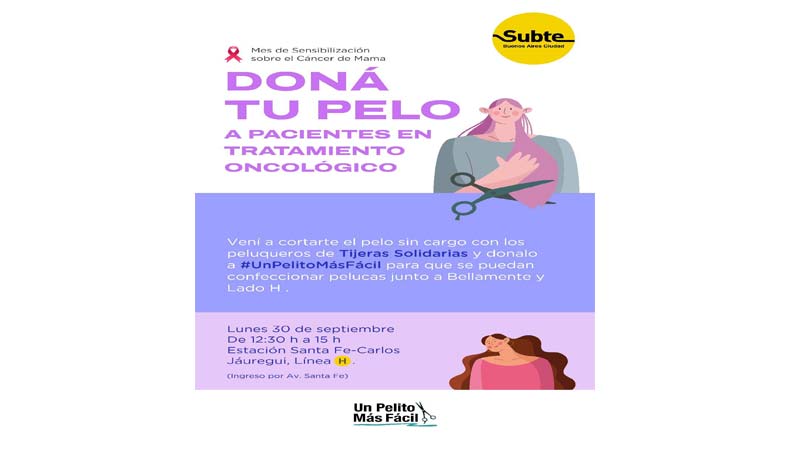 Como anticipo del mes de sensibilización sobre el Cáncer de Mama, Subterráneos de Buenos Aires S.E. (SBASE) se suma, el próximo lunes, a la campaña #UnPelitoMásFácil, que propone la donación de pelo para pacientes oncológicos.