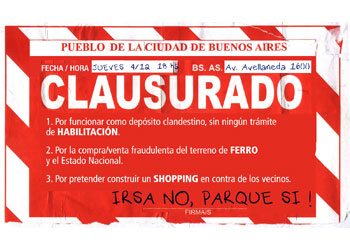 Este jueves 4 de diciembre a las 18:00 horas, los vecinos de Caballito acompañados por representantes de la Legislatura Porteña y de la Junta Comunal Nro. 6 de Caballito realizarán una Clausura simbólica en la Av. Avellaneda 1600 esq. Alte. Seguí, en la puerta del predio que IRSA ocupa luego de la compra/venta fraudulenta del 20 de enero de 1999. En el predio de 2,4 Hectáreas funciona un depósito a cielo abierto sin habilitación ni permiso del Gobierno Porteño donde se encuentran almacenados cerca de 410 containers.