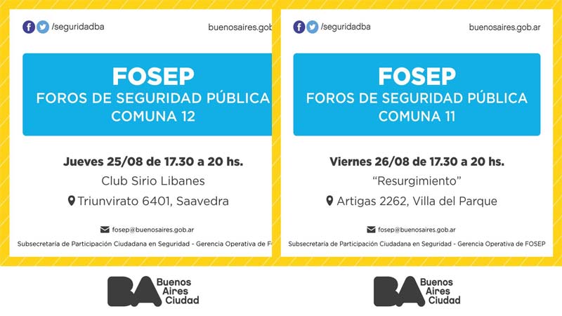Durante el mes de agosto y con una última fecha en septiembre se realizaran de forma presencial en todas las comunas de la Ciudad los Foros de Seguridad Pública, son espacios participativos para buscar soluciones conjuntas a la seguridad en la Ciudad, los Foros de Seguridad Pública (FOSEP) son espacios participativos para abordar las problemáticas que atraviesan los vecinos respecto a la seguridad en la Ciudad, y así trabajar de forma conjunta en la búsqueda de soluciones, escuchando a sus protagonistas ante situaciones concretas de cada comuna.