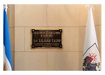 La placa, que fue descubierta por el director de Asuntos Culturales y Patrimoniales, Juan Diego Bellocchio, tiene la siguiente inscripción: "Homenaje de la Legislatura de la Ciudad Autónoma de Buenos Aires a la Lic. Liliana Calvo por su invalorable contribución al conocimiento y conservación del patrimonio de este Monumento Histórico Nacional". dijeron presente familiares, amigos y ex compañeros. La iniciativa fue de la diputada de mandato cumplido, Carmen Polledo.