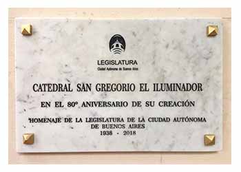 La Legislatura de la Ciudad de Buenos Aires descubrió una placa por el 80º aniversario de la creación de la Catedral San Gregorio el Iluminador el martes 18 de diciembre, el legislador Daniel Presti, quien impulsó el proyecto, dijo que "Armenia tiene un pedacito de su país en Palermo". "Rememoro a principios del siglo XX cómo se ha buscado y congregado la comunidad armenia después del Holocausto armenio y cómo el país le fue abriendo las puertas a la comunidad, a las más de 150.000 personas con origen armenio", agregó Presti. "Quiero referirme a estas tormentas que hoy nosotros estamos atravesando y cómo juntos y unidos la comunidad armenia salió adelante. El mensaje es que nosotros avancemos para salir adelante en estas tormentas que estamos atravesando". Por último pidió "avanzar juntos en una mejor comunidad, hacerla más junta" y opinó que "la comunidad armenia es un ejemplo en este sentido".