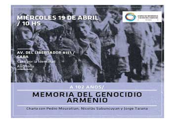 El próximo miércoles 19 de abril a las 10:00 horas en la Casa por la Identidad del Espacio Memoria y Derechos Humanos, ex ESMA, en la Avenida del Libertador 8151, de la Ciudad Autónoma de Buenos Aires, se realizará una charla abierta con Jorge Taiana, actual vicepresidente del Parlasur y el Ministro de Relaciones Exteriores en ejercicio durante el proceso de elaboración y sanción de la Ley 26.199, Pedro Mouratian, experto consultor de ACNUDH y ex interventor del INADI y uno de los impulsores del reconocimiento oficial, y Nicolás Sabuncuyan, director del Consejo Nacional Armenio de Argentina. La actividad está enmarcada en el 102º aniversario del inicio del Genocidio Armenio y a diez años de la sanción de la Ley 26.199 por la que el Estado argentino reconoció este crimen de lesa humanidad.
