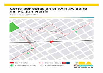Para continuar con las obras del Viaducto de la línea San Martín, que va a mejorar la circulación eliminando 11 barreras y abriendo 9 cruces seguros entre las estaciones Palermo y La Paternal, a partir del jueves 21 de febrero y por aproximadamente un mes el paso a nivel de la av. Beiró y las vías del FC San Martín (av. Beiró y Joaquín V. González - Villa Devoto) estará cerrado.