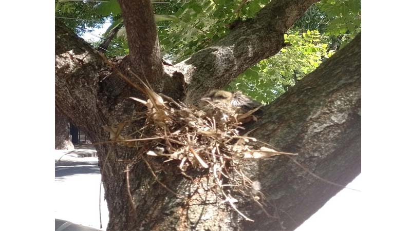 La ciudad no se encuentra por ahora en su máximo nivel de actividad, será por eso que caminando la comuna con un vecino encontramos en una rama baja de un árbol un nido de una paloma torcaza y un pichón estaba esperando la llegada de su madre a alimentarlo, una imagen de lo más tierna en el medio de la ciudad, nos alejamos para no molestar su tranquilidad, el nido estaba construido de palitos, los pichones reciben la leche de buche, sustancia rica en proteínas y lípidos que producen tanto el macho como la hembra, los dos cuidan del pichón.