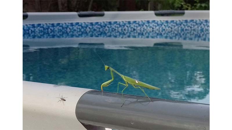Una semana calurosa en la ciudad y en casi todo el país, para aquellos que no tengan la suerte de poder estar vacacionando en la costa o en el campo, poder estar al lado del mar o de algún rio o tengan pileta de natación en su casa, hay que tener en cuenta medidas para protegerse del calor extremo, todos buscamos en fresco, también los insectos, en la foto que acompaña esta nota se puede observar a una mantis religiosa o vulgarmente llamado tata dios al borde de una pileta de lona, tratando de cazar a otro insecto que llego también atraído por tomar agua y el fresco del agua de la pileta.