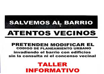 En alerta por los nuevos códigos, el de Edificación y el Urbano-Ambiental, los vecinos de "Salvemos Al Barrio" y "Vecinos por las Casas Bajas" de las Comunas 12 y 15, organizaron talleres informativos para defender la identidad de los barrios, todos los miércoles a las 20:00 horas se reúnen en la calle Terrada y Salvador María del Carril. También tienen prevista otras acciones como caravanas con vehículos los días sábados por la mañana por los barrios, folletos informativos, mail a funcionarios y visibilización en las redes sociales, mesas para firmas de adhesión para acompañar un petitorio, en legislatura, judicial, etc; los vecinos en campaña para que la zona de casas bajas, no se convierta en un lugar lleno de edificios.