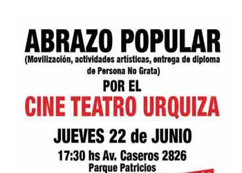 Este jueves 22 de Junio a las 17:30 horas, a un Abrazo Popular y actividades artísticas por el Cine Teatro Urquiza de Parque Patricios en Av. Caseros 2826, de la Comuna 4.