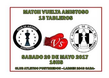 En el encuentro de ida disputado en el reducto de Villa del Parque el resultado favoreció al local por 8.5 a 4.5. Por lo cual Zugzwang esta obligado a ganar en su territorio para dar vuelta la historia y para cantar victoria. Acerca del match que sostuvieron el viernes 5 de mayo el Club de Ajedrez Zugzwang en representación del Club Atlético Pueyrredon frente al elenco del Club de Ajedrez Villa del Parque en las instalaciones del Club de Ajedrez de Villa del Parque situado en Santo Tome 3823, de la Comuna 11.
