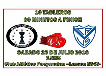Ya se confirmo con Héctor Díaz, presidente de Ajedrez de Vélez Sarsfield, y con Martin Bitelmajer, Maestro Fide quien conduce la escuela del deporte ciencia de la entidad deportiva de Liniers, que el match entre Club Zugzwang en representación del Club Atlético Pueyrredon y el elenco velezano será el 23 de julio en las instalaciones del Club Atlético Pueyrredon situado en Larsen 2843 Capital Federal a las 15hs.