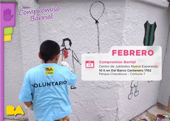 Compromiso Barrial vuelve con actividades participativas para todos los vecinos de la Ciudad,el viernes 13 de febrero, vecinos y voluntarios de Parque Chacabuco y Flores firmarán el primer Compromiso Barrial del 2015. Las actividades comenzarán a partir de las 10:00 horas en el centro de jubilados Nuestra Esperanza, ubicado en Del Barco Centenera 1762, el cual se creó hace pocos años por un grupo de vecinos que soñaban con un espacio propio para poder llevar a cabo diversas actividades. Allí, quienes se acerquen, podrán poner en valor el espacio con la pintada comunitaria de un mural artístico a cargo del Grupo de Artistas de Boedo.