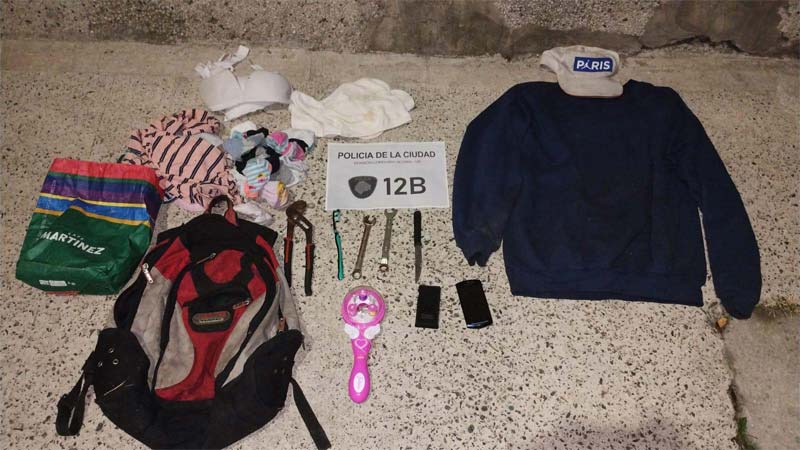 Frente a testigos, el delincuente fue requisado e identificado, y como no poseía elementos de delito se hizo un rastrillaje en la zona, que permitió encontrar en la calle Habana al 3100, una mochila, que tenía en su interior una pinza pico de loro y distintas llaves para tuercas; un cuchillo, un teléfono celular, una gorra y un buzo.