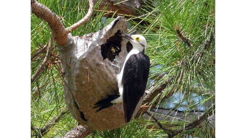 Se podría decir que esta actividad se vuelve un vicio, el estar atentos al medio ambiente es una ocupación que hace bien, combate el estrés y que deberíamos practicarla más seguido, la fotografía que acompaña esta nota es de un Carpintero blanco, alimentándose de un nido de Avispas Camoati, que estaba ubicado en un pino y se rompió con una gran tormenta en la zona de Gualeguaychú, Entre Ríos, los nidos de estas avispas penden en su mayoría de los árboles.