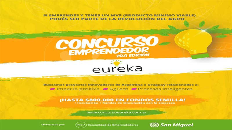 2° edición del concurso eureka para emprendedores, es de la Federación de Comercio e Industria de la Ciudad Autónoma de Buenos Aires (FECOBA), a través del área Jóvenes Empresarios, a cargo de Diego Nunes, invitan a participar de la segunda edición del concurso Eureka, una iniciativa que busca detectar y reconocer propuestas innovadoras enfocadas en la transformación de la cadena agroindustrial y frutihortícola, esta propuesta es presentada por San Miguel – empresa líder en la producción y exportación de cítricos del hemisferio sur con más de 60 años de experiencia – y motorizado por la Asociación Civil INICIA.