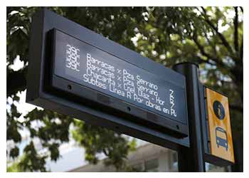 Los carteles colocados en los paradores de los metrobuses tienen una dimensión de 1,20 metros x 30 centímetros, son de metal y poseen una pantalla LED con líneas de texto que informan sobre la línea de colectivo, en qué dirección va el interno y en cuánto tiempo va a llegar a la parada.