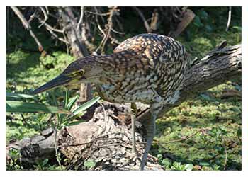 Cámara en mano y atentos al avistaje de las especies que habitan las lagunas y bañados, fotografiamos gracias al zoom, a una Garza Hocó la cual se podría decir que se encontraba mimetizada entre la vegetación esperando muy quieta que apareciera su almuerzo, el cual consiste en peces, ranas, pequeños mamíferos, allí permaneció tranquila mientras la fotografiamos, tal vez sabiendo que por más depredadores que somos los humanos, ella se encontraba en un área protegida y de difícil acceso.