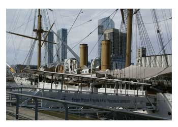 La Fragata Sarmiento en Puerto Madero fue construida en Inglaterra y se convirtió en 1897 en el primer buque escuela moderno que tuvo la Argentina. En el pasado realizó 39 viajes alrededor del mundo y hoy es un Museo flotante declarado Monumento Histórico Nacional.