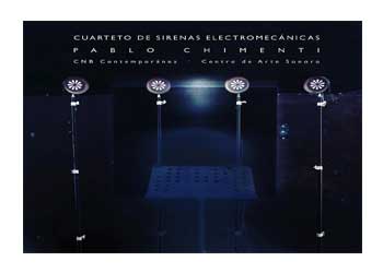 Este sábado 16 setiembre y el próximo jueves 21 a las 20:30 horas, en la Casa Nacional del Bicentenario, en Riobamba 985, 3° piso de la Ciudad Autónoma de Buenos Aires, Activación del cuarteto de sirenas electromagnéticas de Pablo Chimenti, los dispositivos de señalización acústica actúan en situaciones de emergencia o de inminente peligro. En el cuarteto de sirenas electromecánicas se intervienen los modos en que operan habitualmente estos artefactos, modificando el código establecido por la señal y dilatando el estado de alerta.