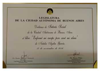 Presentan el libro "Enfermé mi cuerpo, pero sané mi alma" declarado de Interés Social por la Legislatura, el sábado pasado, en el Club 25 de Mayo de Villa del Parque, se llevó a cabo la presentación del libro "Enfermé mi cuerpo, pero sané mi alma" de Natalia García, declarado de Interés Social de la Ciudad Autónoma de Buenos Aires por la Legislatura porteña, a partir de la iniciativa de la Diputada Cristina García (Pro).