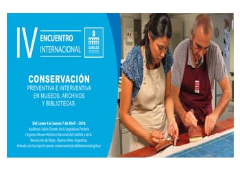 IV Encuentro Internacional Conservación Preventiva e Interventiva en Museos, Archivos y Bibliotecas, con el objetivo de favorecer al intercambio de experiencias entre estudiantes, profesionales y especialistas que trabajan cotidianamente en la conservación del patrimonio en museos, bibliotecas y archivos, se realizará una nueva edición del "Encuentro Internacional de Conservación Preventiva e Interventiva en Museos, Archivos y Bibliotecas", a realizarse en Abril de 2016. La organización del mismo estará a cargo del Museo Nacional de Cabildo con el Apoyo del Ministerio español de Asuntos Exteriores y de Cooperación (AECID), Instituto Italiano de Cultura, Ministerio de Cultura de la Nación, La Legislatura Porteña, Importadora Dreschler, Revista Lucas de Leyden y EARA.