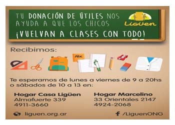 Desde el 1 al 26 de febrero los dos hogares de niños de la Asociación Civil Ligüen, ubicados en el barrio porteño de Parque Patricios, estarán abiertos para recibir las donaciones de lápices, cartucheras, gomas, biromes, sacapuntas, guardapolvos, hojas A4 y todo lo necesario para que los chicos empiecen el nuevo ciclo lectivo con las mochilas bien cargadas.
